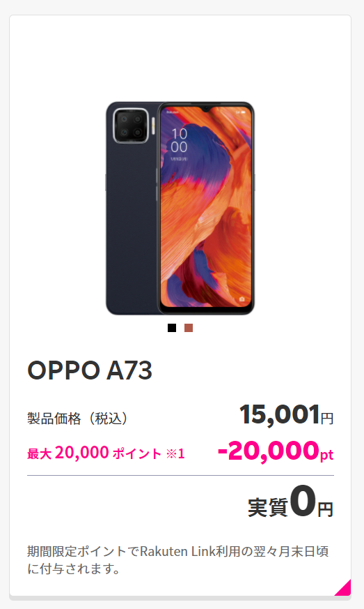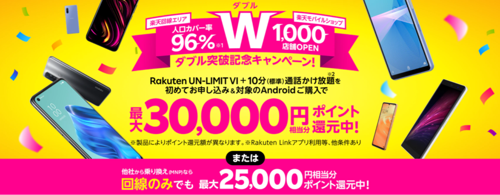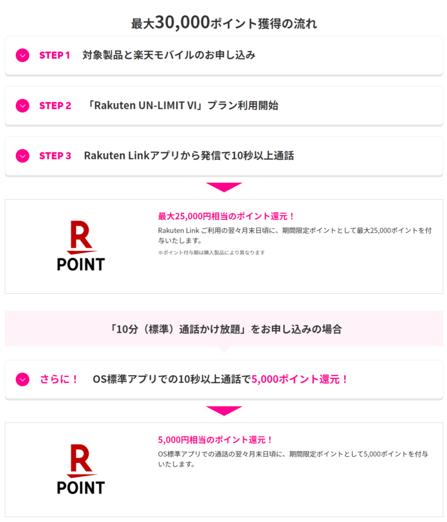 初めてRakuten UN-LIMIT VIと「10分(標準)通話かけ放題」をお申し込みいただいたお客様に10,000円相当分のポイントを還元いたします。さらに対象製品をセットでご購入いただくと、最大20,000円相当分のポイント還元!両方合わせて、合計で最大30,000円相当分のポイント還元となるキャンペーン です。