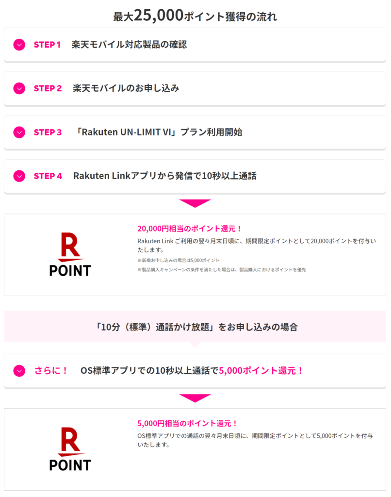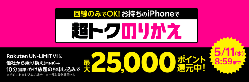 初めてRakuten UN-LIMIT VIと「10分(標準)通話かけ放題」お申し込みいただいたお客様に10,000円相当分のポイントを還元いたします。さらに他社からのお乗り換え(MNP)で、15,000円相当分のポイント還元!両方合わせて、合計で25,000円相当分のポイント還元 となるキャンペーンです。